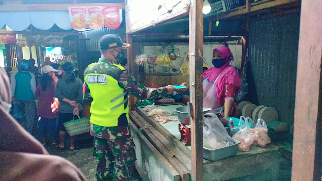 WANMEDIA.CO.ID NGAWI – Untuk mencegah dan memutus rantai penyebaran Covid 19, Anggota Koramil 05/Karangjati Kodim 0805/Ngawi Serka Suparno bersama tiga orang anggota membagikan masker kepada masyarakat bertempat di Pasar Karangjati, Minggu (21/02/2021).