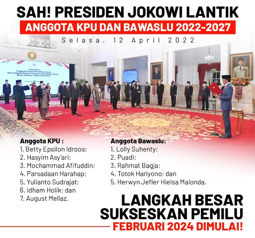 WANMEDIA.CO.ID, JAKARTA – Presiden Joko Widodo melantik dan mengambil sumpah jabatan anggota Komisi Pemilihan Umum (KPU) dan Badan Pengawas Pemilihan Umum (Bawaslu) masa jabatan tahun 2022-2027.