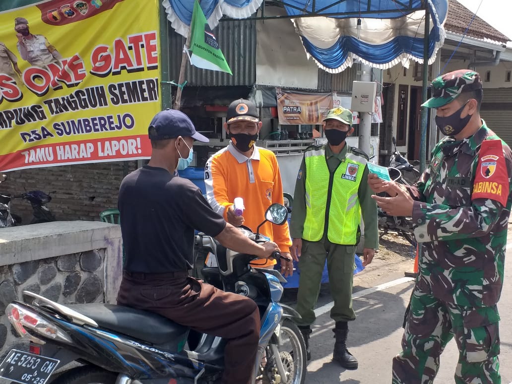 Dengan diberlakukanya kebijakan satu desa satu pintu, Babinsa bersinergi dengan Bhabinkamtibmas melakukan upaya pendisiplinan terkait protokol kesehatan di wilayah binaannya, seperti yang dilakukan Babinsa Koramil 0803/02 Madiun Serma Hariyono bersama Bhabinkamtibmas, tampak melaksanakan pendisiplinan protokol kesehatan terhadap warga yang keluar masuk Desa Sumberejo Kecamatan Madiun, Kabupaten Madiun, Rabu ( 14/04/2021).