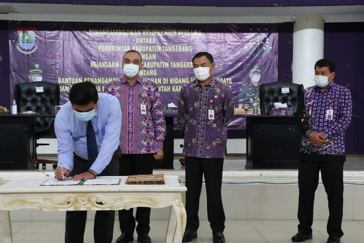 WANMEDIA.CO.ID, KAB-TANGERANG – Bupati Tangerang Ahmed Zaki Iskandar dan Kepala Kejaksaan Negeri Kabupaten Tangerang H.Bahrudin Menandatangi Kesepakatan Bersama Penanganan Permasalahan di Bidang Hukum Perdata dan Tata Usaha Negara.