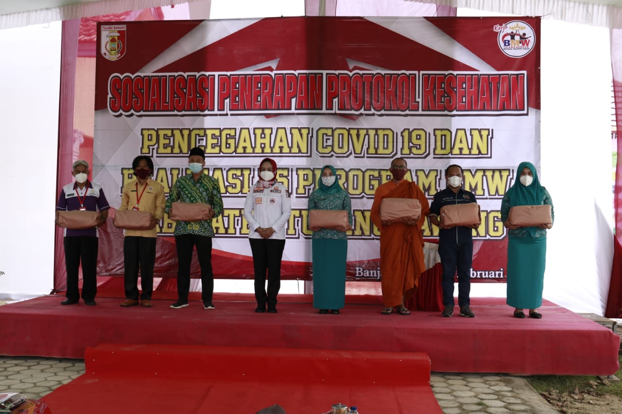 WANMEDIA.co.id, TULANG BAWANG–Bupati Tulang Bawang Dr (Cand) Hj.Winarti, SE, MH memberikan Sosialisasi Penerapan Protokol Kesehatan dan sekaligus memberikan masker dan Realisasi 25 program BMW, bertempat Kampung Tunggal Warga, kecamatan Banjar Agung kabupaten Tulang Bawang, Rabu (10/2/21).