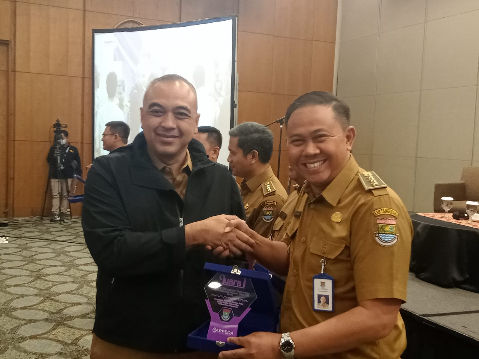 Penghargaan diserahkan langsung oleh Bupati Tangerang, A.Zaki Iskandar kepada Camat Cisoka, Encep Sahayat pada hari Selasa (21/03/2023) di Garuda Ballroom Indinesian Cinvention Exhibition (ICE) BSD Pagedangan.