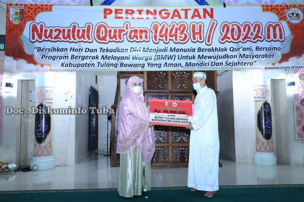 Hadir dalam acara tersebut Bupati Tulang Bawang Dr. Hj. Winarti,SE,MH. Setelah sholat isya berjamaah dilanjutkan dengan acara nuzulul Qur’an dan ditutup dengan sholat tarawih serta pembayaran zakat yang dikoordinir oleh BAZNAZ Kabupaten Tulang Bawang.