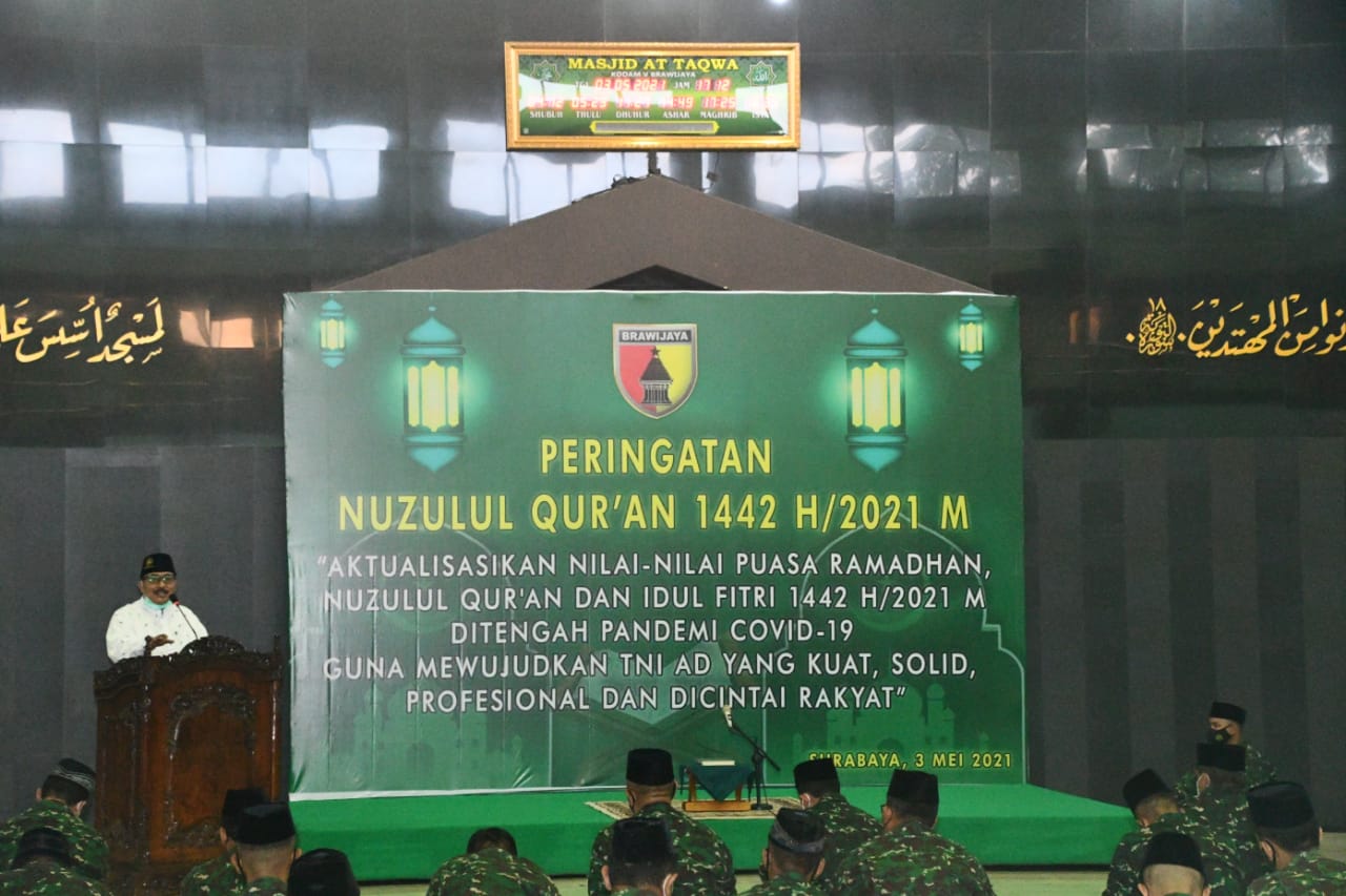 WANMEDIA.CO.ID, MADIUN – Kodam V/Brawijaya menggelar peringatan Nuzulul Qur’an 1442 H/2021 M di Masjid At-Taqwa Kodam V/Brawijaya, Surabaya, Senin (3/5/2021) malam.