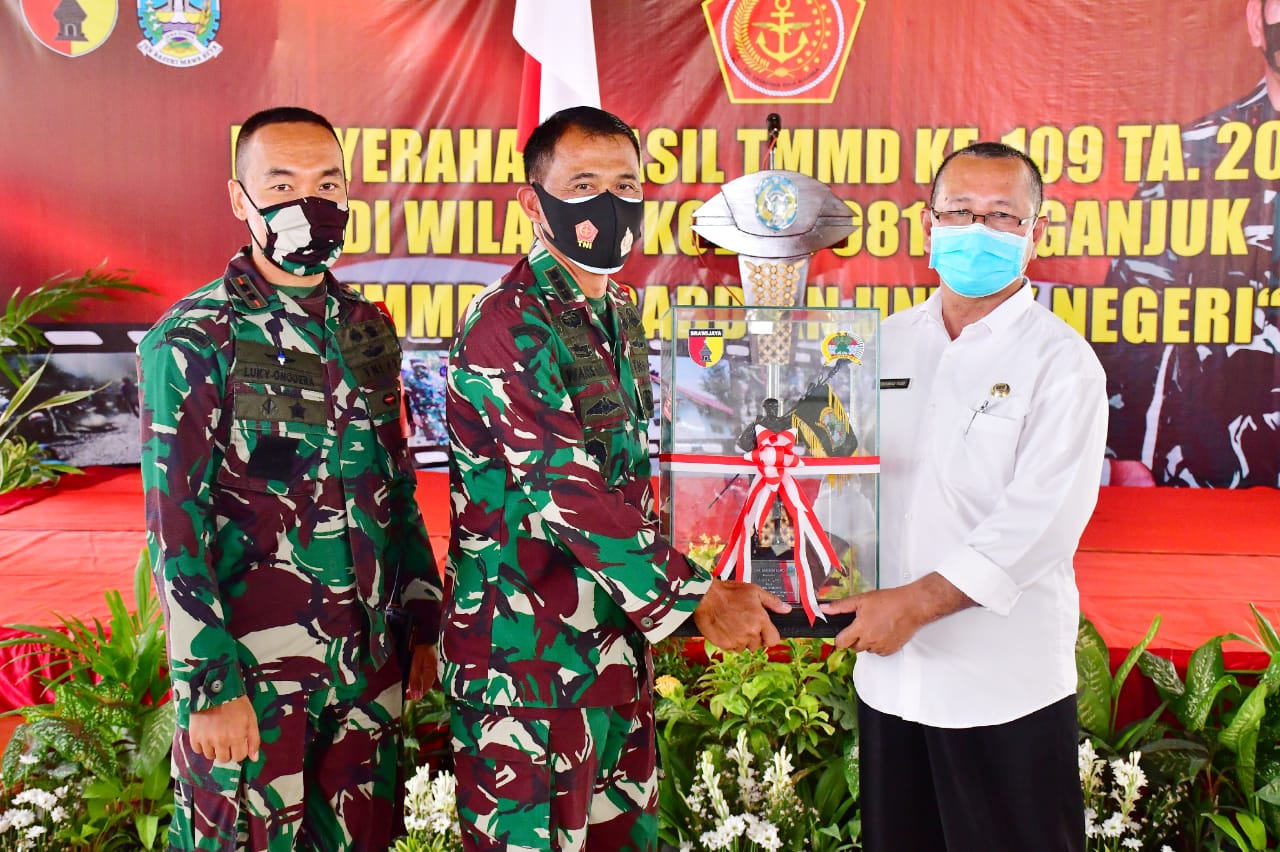 Hasil pelaksanaan program TMMD ke-109 diserahkan dari Dandim 0810/Nganjuk, Letkol Inf Georgius Luky Ariesta, S. I. P., M.Si. selaku Dansatgas TMMD kepada Sekda Kabupaten Nganjuk Drs. M. Yasin.