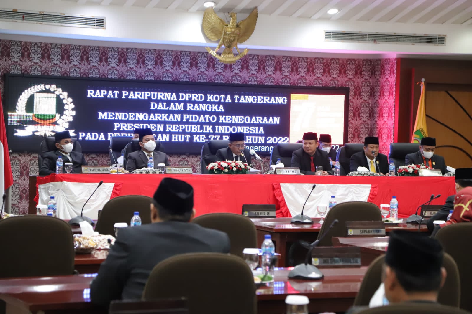WANMEDIA.co.id, KOTA TANGERANG-Dewan Perwakilan Rakyat Daerah (DPRD) Kota Tangerang menggelar Rapat Paripurna mendengarkan Pidato Kenegaraan Presiden Republik Indonesia, pada Peringatan HUT ke-77 Republik Indonesia, yang berlangsung di Ruang Paripurna Puspem Kota Tangerang, Selasa (16/8/22).