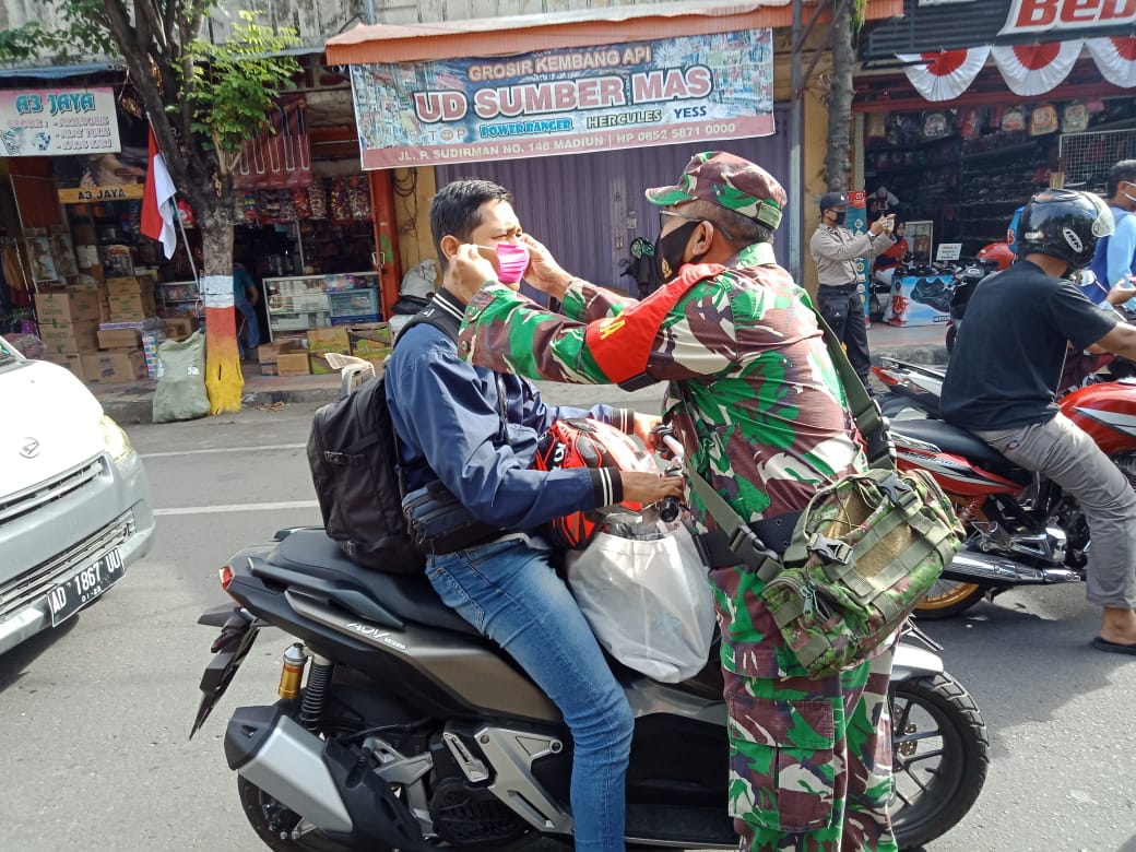 WANMEDIA.CO.ID, MADIUN – Anggota Koramil 0803/01 Taman bagikan masker kepada warga yang melintas di Jl. Panglima Sudirman Kelurahan Keturon, Kecamatan Taman, Kota Madiun. Pembagian masker tersebut dalam rangka mendukung gerakan “Jawa Timur berlasker” serta bertujuan mengantisipasi menyebaran virus corona di tengah masyarakat. Sabtu(12/12/2020)