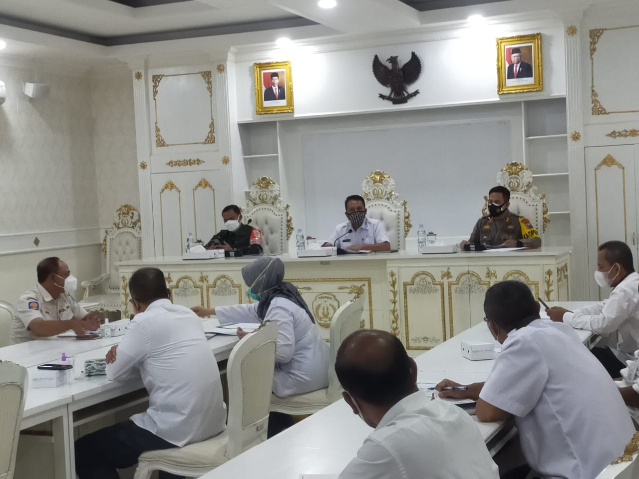 Hadir dalam rapat koordinasi PPKM berbasis mikro dan pembentukan Posko penanganan covid-19 di Bantarangin Gd. Graha Krida Praja Lt. 2 antara lain : Ketua Gugus Covid-19 Kabupaten Ponorogo, Dr. Drs. Agus Pramono MM; Dandim 0802/ Ponorogo, Letkol Inf Sigit Sugiharto; Kapolres Ponorogo, AKBP Mochamad Nur Aziz, SH., S.I.K,. M.Si; Kadinkes Kab. Ponorogo, Drg. Hj. Rahayu Kusdarini., M.Kes; Ketua BPBD Kab Ponorogo, Imam Basori, S.Sos; Kasatpol PP Kab. Ponorogo, Drs. Suko Kartono MM; Kadin PMD Kab. Ponorogo, Bpk. Supriyanto; Kepala BPPKAD Kab. Ponorogo, Ibu Sulistyo Ningsih serta perwakilan Camat se Kabupaten Ponorogo. (Yanto)