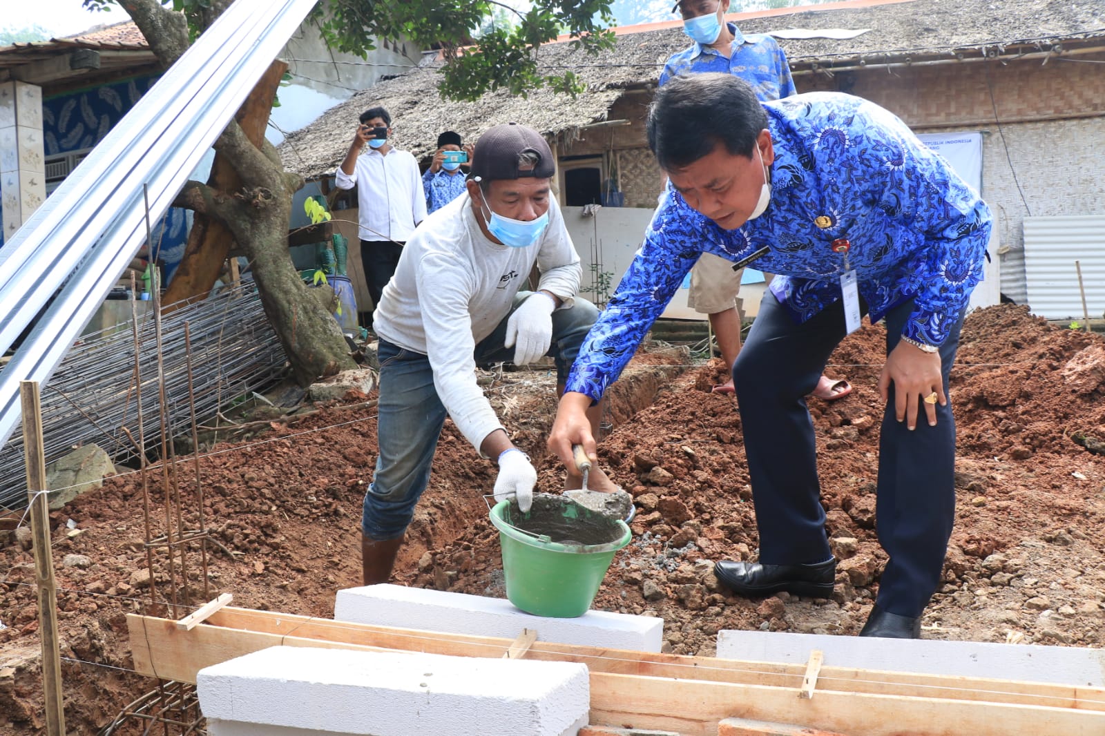 Ketua Korpri Kabupaten Tangerang Moch. Maesyal Rasyid didampingi pengurus dan anggota Korpri serta Camat Tigaraksa meletakan batu pertama bedah rumah warga kurang mampu, Rabu (24/11/2021).