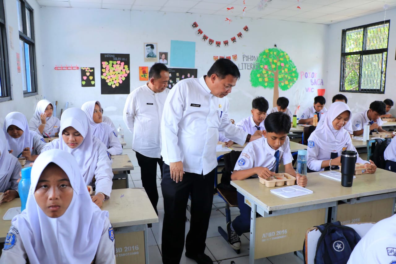 Kepala Dinas Pendidikan Kota Tangerang, Jamaluddin, yang memantau langsung pelaksanaan program ini, turut memeriksa penyajian dan takaran gizi makanan.