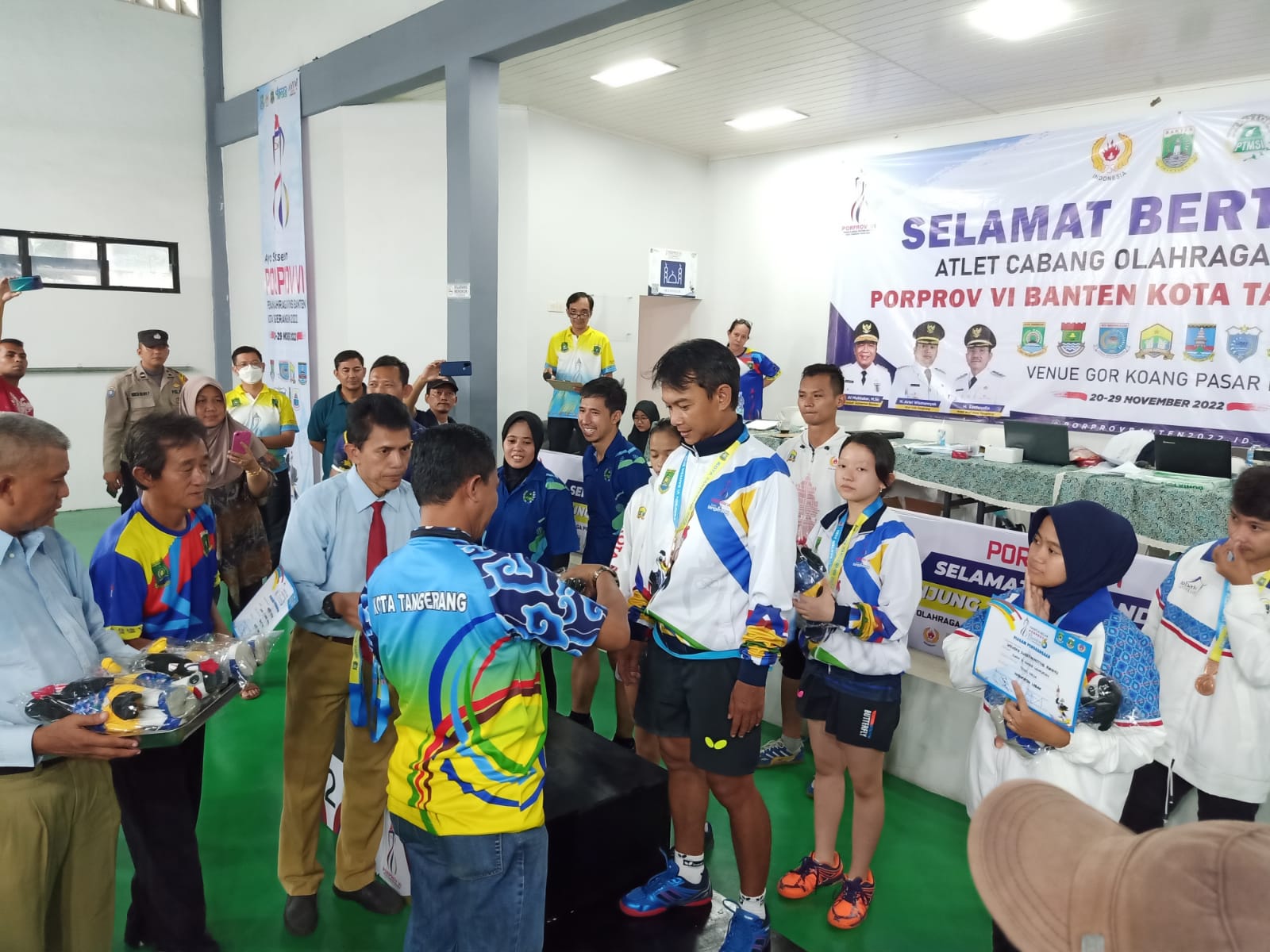 Hadir Kepala Dinas Pemuda dan Olahraga (Dispora) Provinsi Banten Ahmad Syaukani, Ketua KONI Provinsi Banten Edi Ariadi, dan Ketua Umum PB Porprov VI Banten Sachrudin, yang berkesempatan mengalungkan medali kepada atlet yang menjadi juara cabor tenis meja tersebut.
