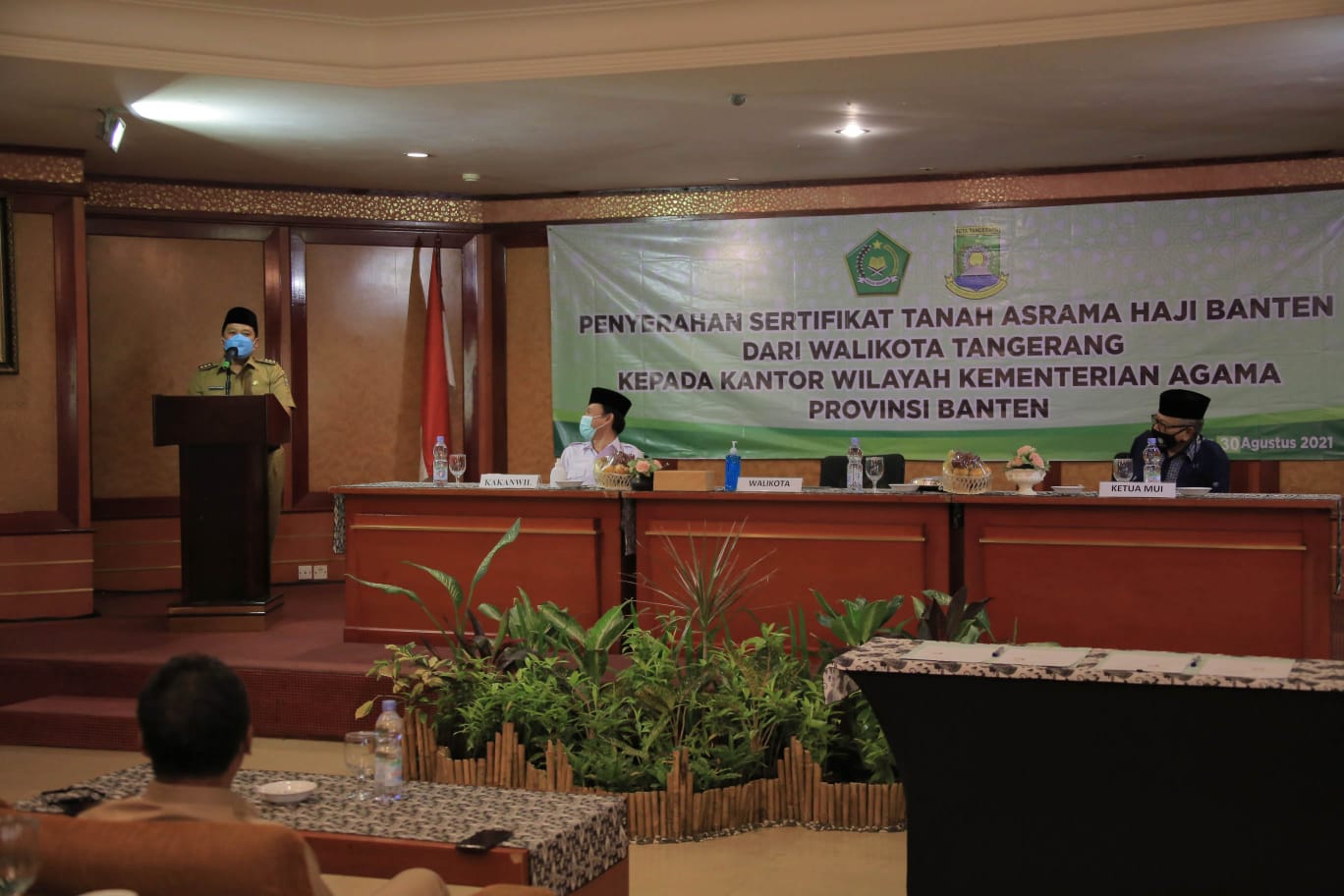 Penyerahan sertipikat tanah asrama haji seluas 4,1 Ha dilakukan secara langsung oleh Wali Kota Tangerang kepada Kepala Kantor Wilayah Kementerian Agama Provinsi Banten Nanang Fatchulrochman.