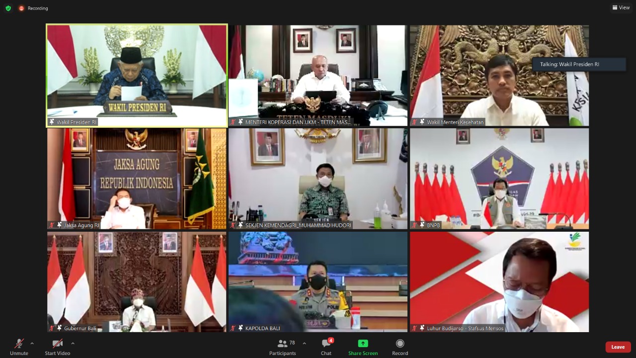 Pertemuan virtual yang dipimpin oleh Wakil Presiden RI K.H. Ma’ruf Amin itu, turut diikuti oleh Menteri Koperasi dan Usaha Kecil Menengah, Wakil Menteri Kesehatan, Jaksa Agung, Juru Bicara Satgas Penanganan Covid-19 Wiku Adisasmito yang mewakili Kepala BNPB, Gubernur Bali, Bupati/Walikota se-Provinsi Bali, dan Satgas Covid-19 Provinsi/Kabupaten/Kota se-Provinsi Bali.