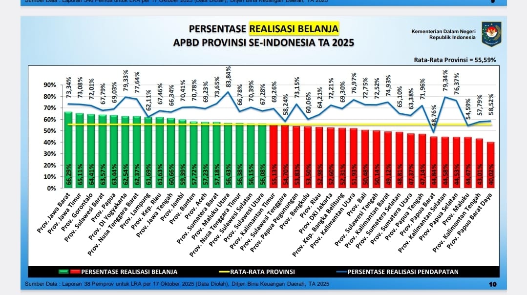 Data tersebut berdasarkan Direktorat Jenderal Bina Keuangan Daerah Kemendagri per 17 Oktober 2025. Secara nasional, rata-rata realisasi pendapatan APBD provinsi di Indonesia mencapai 70,01 persen, sedangkan rata-rata realisasi belanja sebesar 55,59 persen.