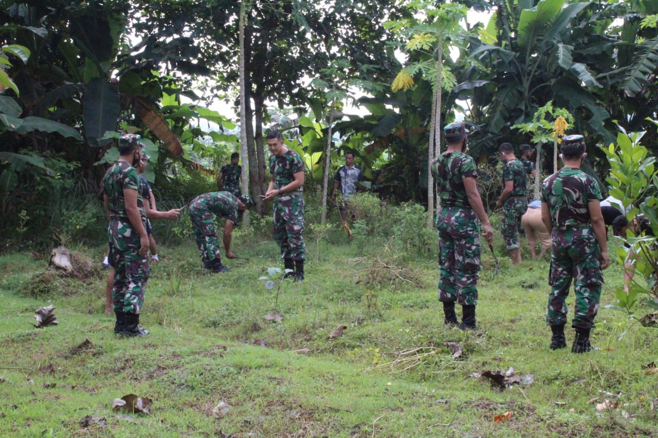 Anggota personil Kodim 0806/Trenggalek saling bergotong – royong membersihkan lahan pekarangan untuk dijadikan taman apotik hidup untuk ditanami berbagai jenis tumbuh-tumbuhan yang dapat dijadikan bahan obat-obatan tradisonal.