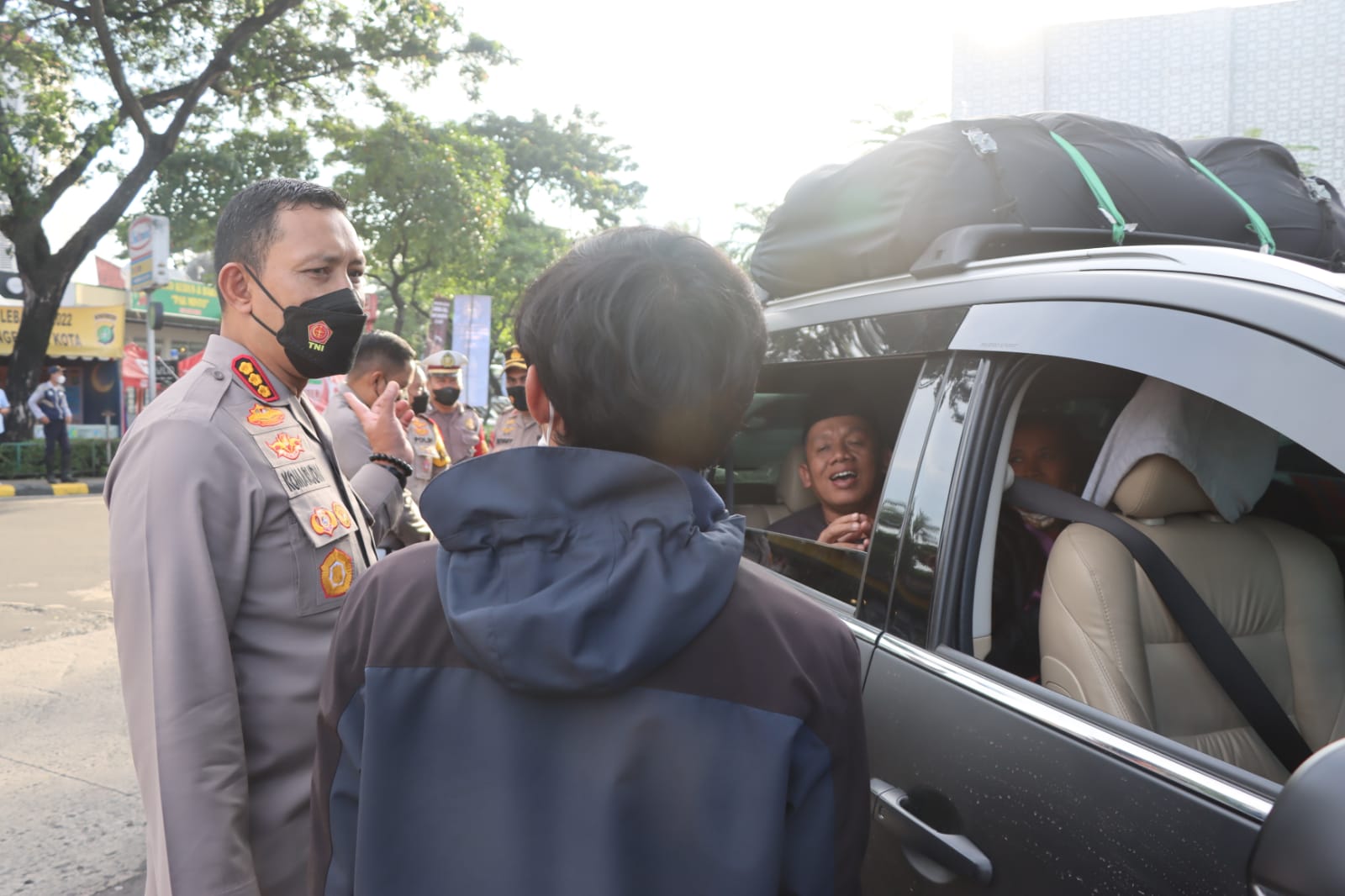 Pada momen arus balik H+4 lebaran 1443 Hijriah, Kapolres Metro Tangerang Kombes Pol Komarudin menyapa beberapa pemudik yang baru saja kembali dari daerah Sumatera menuju Tangerang – Jakarta.