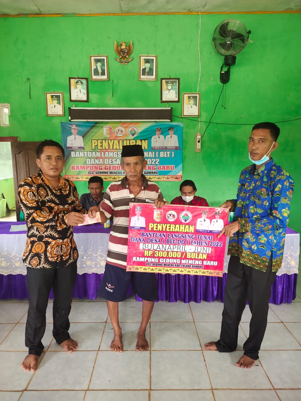 Melaksanakan pembagian BLT bulan April, Mei, Juni. Perbulan 300.000, sebanyak 101 kepala keluarga Penerima Manfaat (KPM) Jumat yang diterima masyarakat 900.000 kegiatan berlangsung di balai Kampung Gedung Meneng Baru, Jumat (24/06/2022).