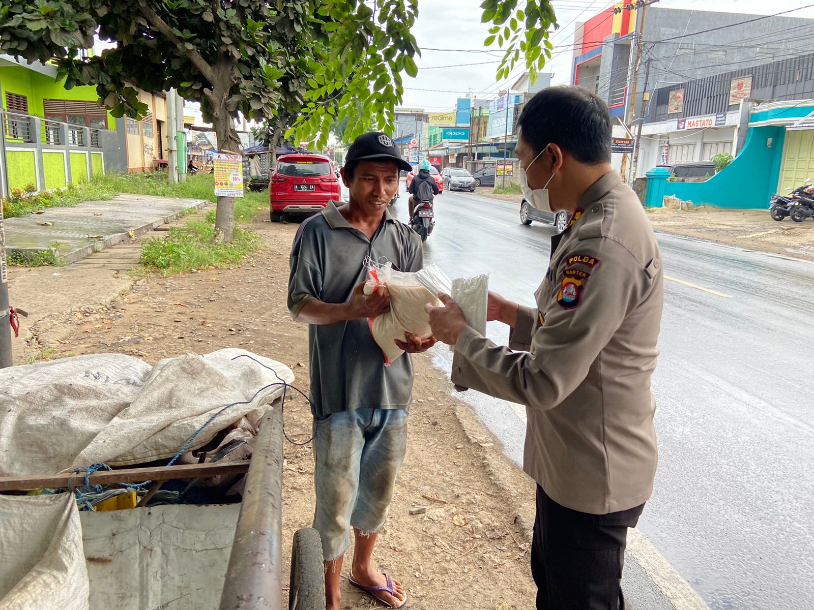 WANMEDIA.CO.ID, SERANG.- Sebagai bentuk kepedulian Polri kepada masyarakat ditengah situasi pandemi Covid-19, Bidhumas Polda Banten melaksanakan bantuan sosial dalam rangka Jumat Barokah dengan cara membagikan puluhan paket beras dan masker kepada para pemulung, tukang parkir, tukang becak, tukang ojeg pangkalan serta pengemis di sepanjang jalan Kota Serang pada Jumat (28/01).