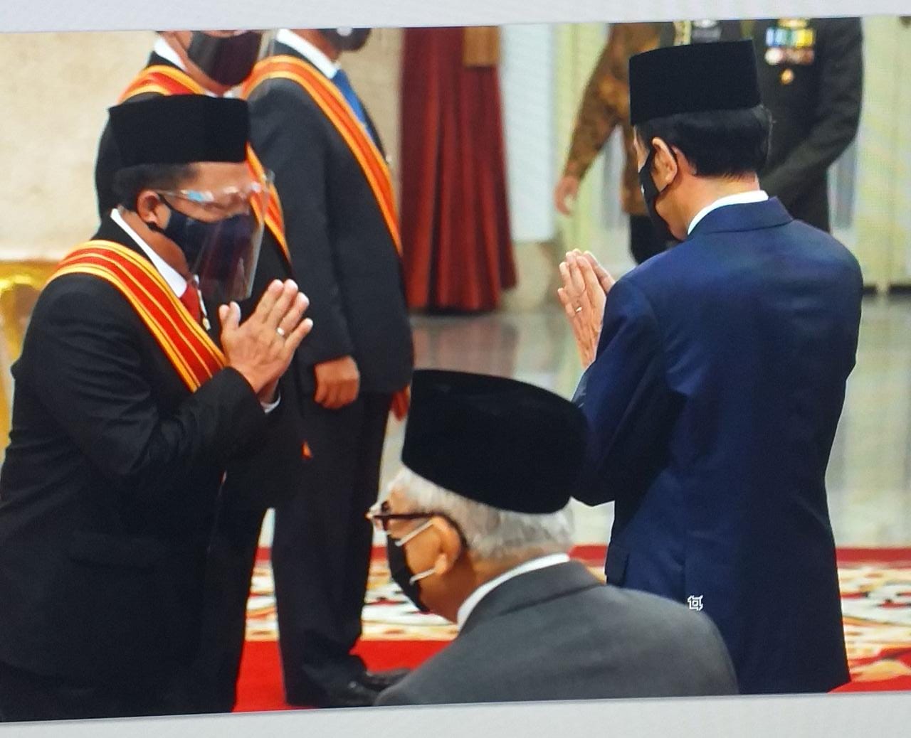 “Menganugerahkan tanda kehormatan Bintang Mahaputera dan Bintang Jasa kepada mereka yang nama, pangkat, dan jabatannya tersebut dalam lampiran keputusan ini sebagai penghargaan atas jasa-jasanya sesuai ketentuan syarat khusus dalam rangka memperoleh tanda kehormatan Bintang Mahaputera dan Bintang Jasa sebagaimana diatur dalam undang-undang,” kata Plh Sekretaris Militer Presiden Brigjen TNI Basuki Nugroho saat membacakan Keppres dalam upacara, Rabu (11/11/2020)