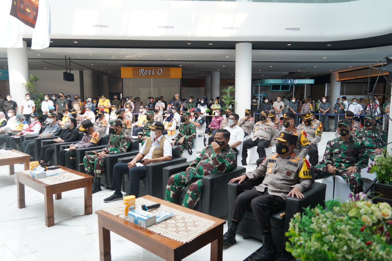 WANMEDIA.CO.ID, CILEGON – Kapolri Jenderal Listyo Sigit bersama Panglima TNI Marsekal Hadi Tjahjanto, Ketua DPR RI Puan Maharani dan rombongan tinjau pelaksanaan operasi Ketupat Maung 2021 dalam rangka memastikan pelaksanaan operasi yang sedang dijalankan oleh Polri di Polda Banten dan melihat situasi terkini yang ada ada di Pelabuhan Merak, Minggu (09/05/2021).