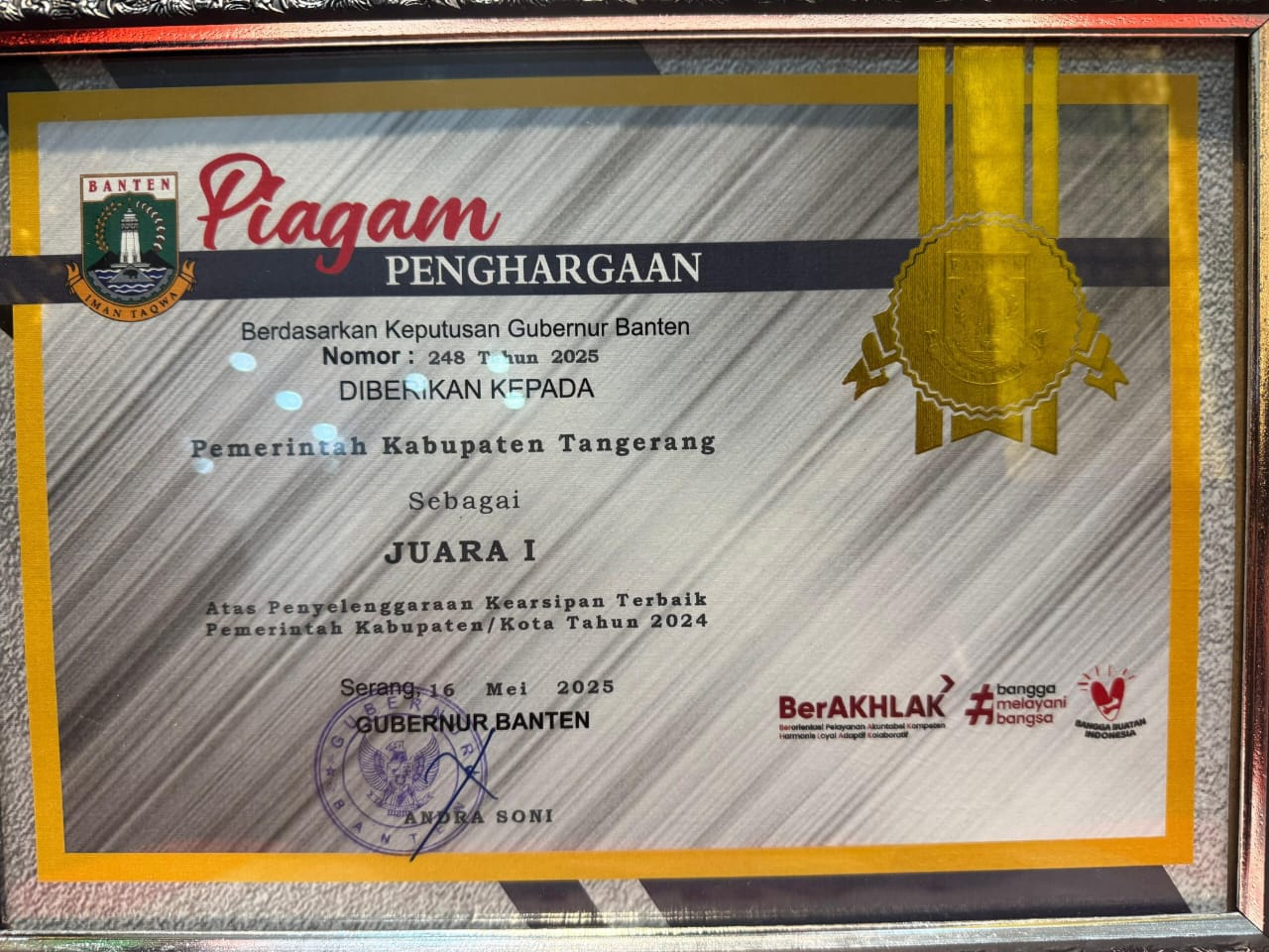 Penghargaan tersebut diserahkan langsung oleh Pemerintah Provinsi Banten dalam acara Penyerahan Penghargaan Pengawasan Kearsipan dan Penandatanganan Nota Kesepahaman Gerakan Sadar Tertib Arsip, yang berlangsung di Pendopo Gubernur Banten, Selasa (26/8/2025).
