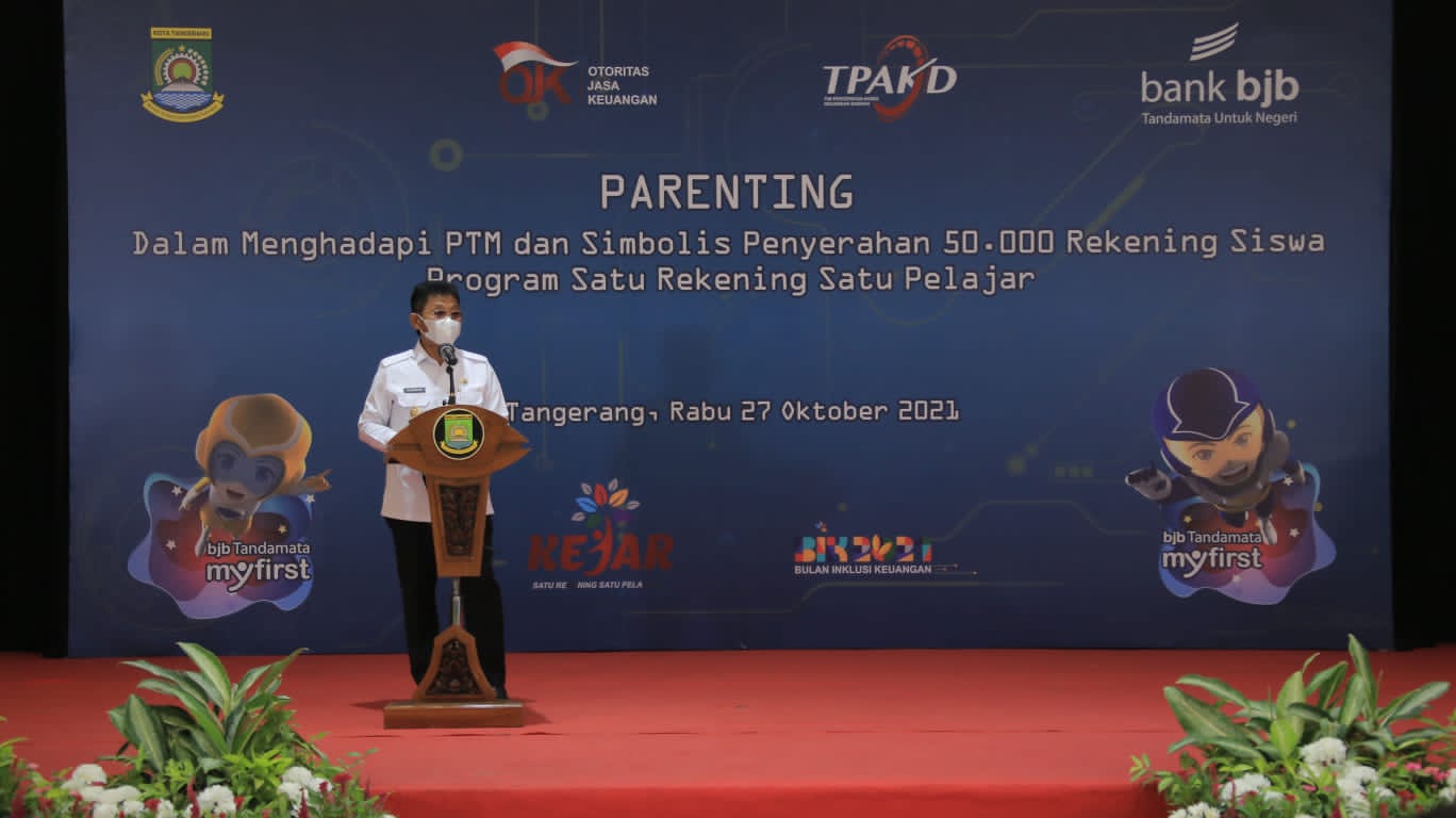 Wakil Wali Kota Tangerang H. Sachrudin menyerahkan secara simbolis buku tabungan kepada perwakilan siswa dari jenjang Sekolah Dasar (SD) dan Sekolah Menengah Pertama (SMP) dalam acara Parenting Dalam Menghadapi PTM dan penyerahan Secara Simbolis 50.000 Rekening Siswa, Program Satu Rekening Satu Pelajar.