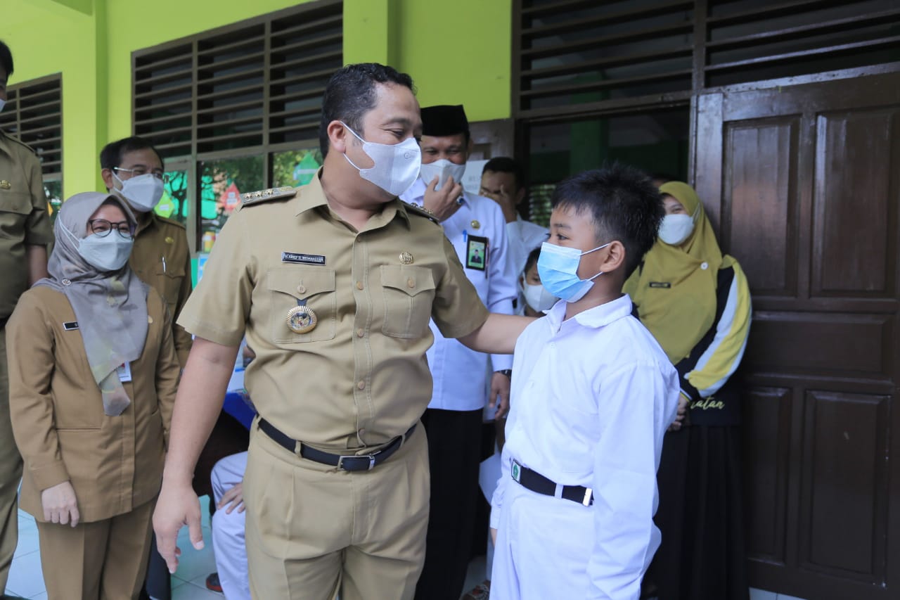 Wali Kota Tangerang H. Arief R. Wismansyah didampingi Kepala Dinas Kesehatan Dini Angraeni dan Kepala Dinas Pendidikan Kota Tangerang Jamaluddin meninjau langsung pelaksanaan vaksinasi bagi anak umur 6 sampai 11 tahun yang berlokasi di Sekolah Madrasah Ibtidaiyah (MI) Negeri 1 Kota Tangerang Kecamatan Tangerang Kelurahan Babakan, Selasa (14/12/21).