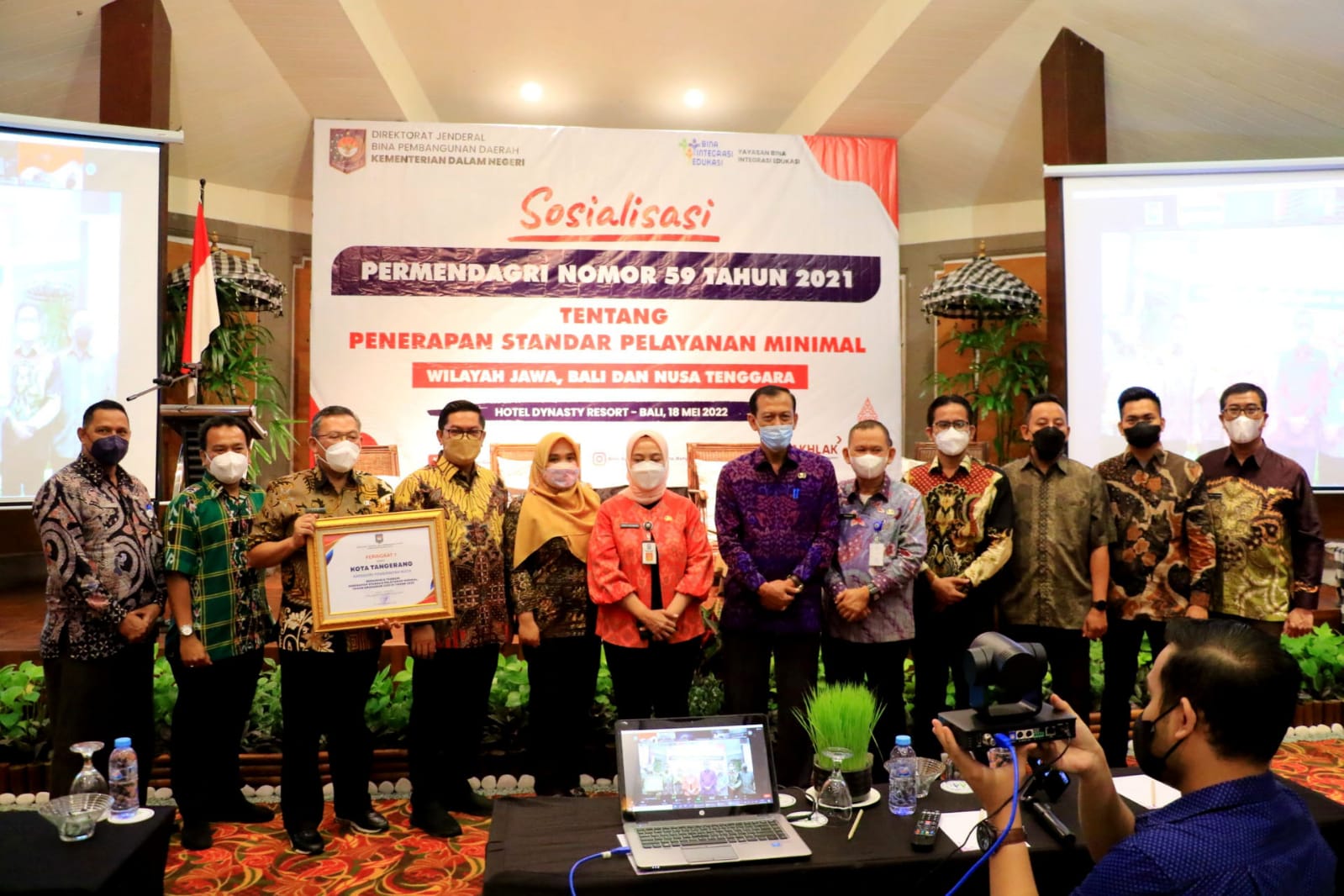 Sebagai informasi, penghargaan diberikan langsung oleh Sekretaris Ditjen Bina Pembangunan Daerah Sri Purwaningsih, SH.,MAP kepada Pemerintah Kota Tangerang dalam acara Sosialisasi Permendagri Nomor 59 Tahun 2021 tentang Penerapan Standar Pelayanan Minimal Wilayah Jawa, Bali dan Nusa Tenggara di Hotel Dynasti Resort, Kuta, Bali. (sarip)