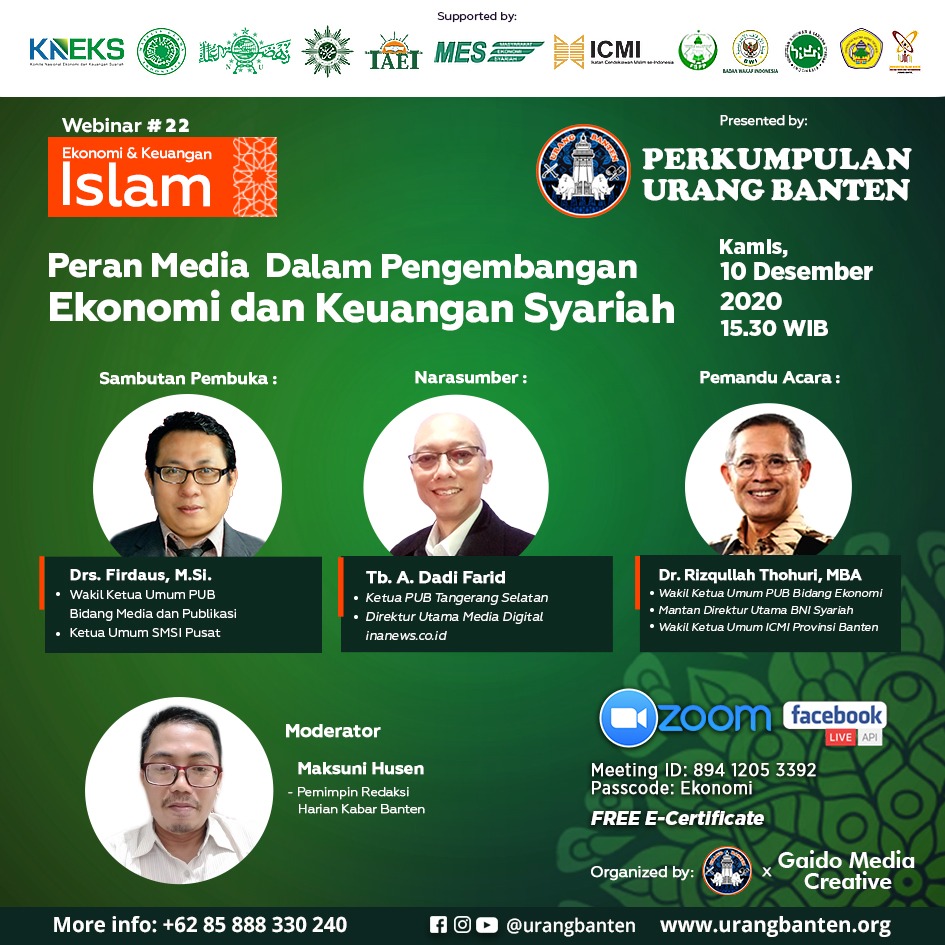 WANMEDIA.CO.ID, BANTEN – Perkumpulan Urang Banten (PUB) melalui Bidang Ekonomi menggelar webinar bertajuk “Peran Media Dalam Pengembangan Ekonomi dan Keuangan Syariah”, Kamis (10/12/2020).