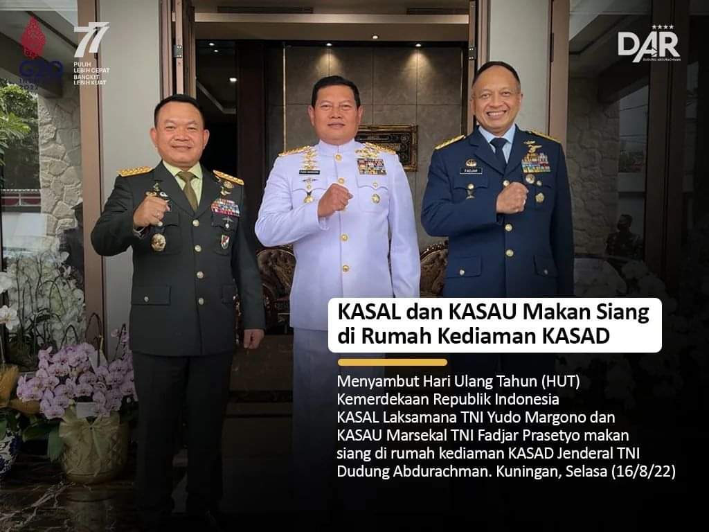 WANMEDIA.CO.ID, JAKARTA – Tiga pimpinan matra TNI berkumpul di kediaman Kepala Staf Angkatan Darat (KSAD) Jenderal TNI Dudung Abdurrahman usai mengikuti pidato kenegaraan Presiden Joko Widodo (Jokowi), Selasa (16/8/2022). Selain KSAD ada Kepala Staf Angkatan Laut (KSAL) Laksamana Yudo Margono dan Kepala Staf Angkatan Udara (KSAU) Marsekal Fadjar Prasetyo dalam pertemuan itu.