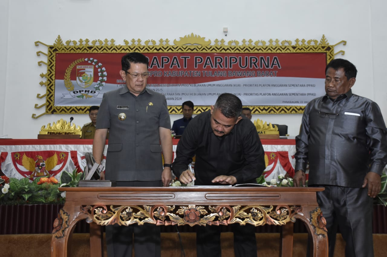 Penandatanganan tersebut dilaksanakan disela rapat paripurna DPRD Tubaba, Senin (22/07/2024). Turut hadir secara langsung Pj. Bupati, Jajaran Forkopimda, Kepala OPD, Camat, serta tamu undangan lainnya.