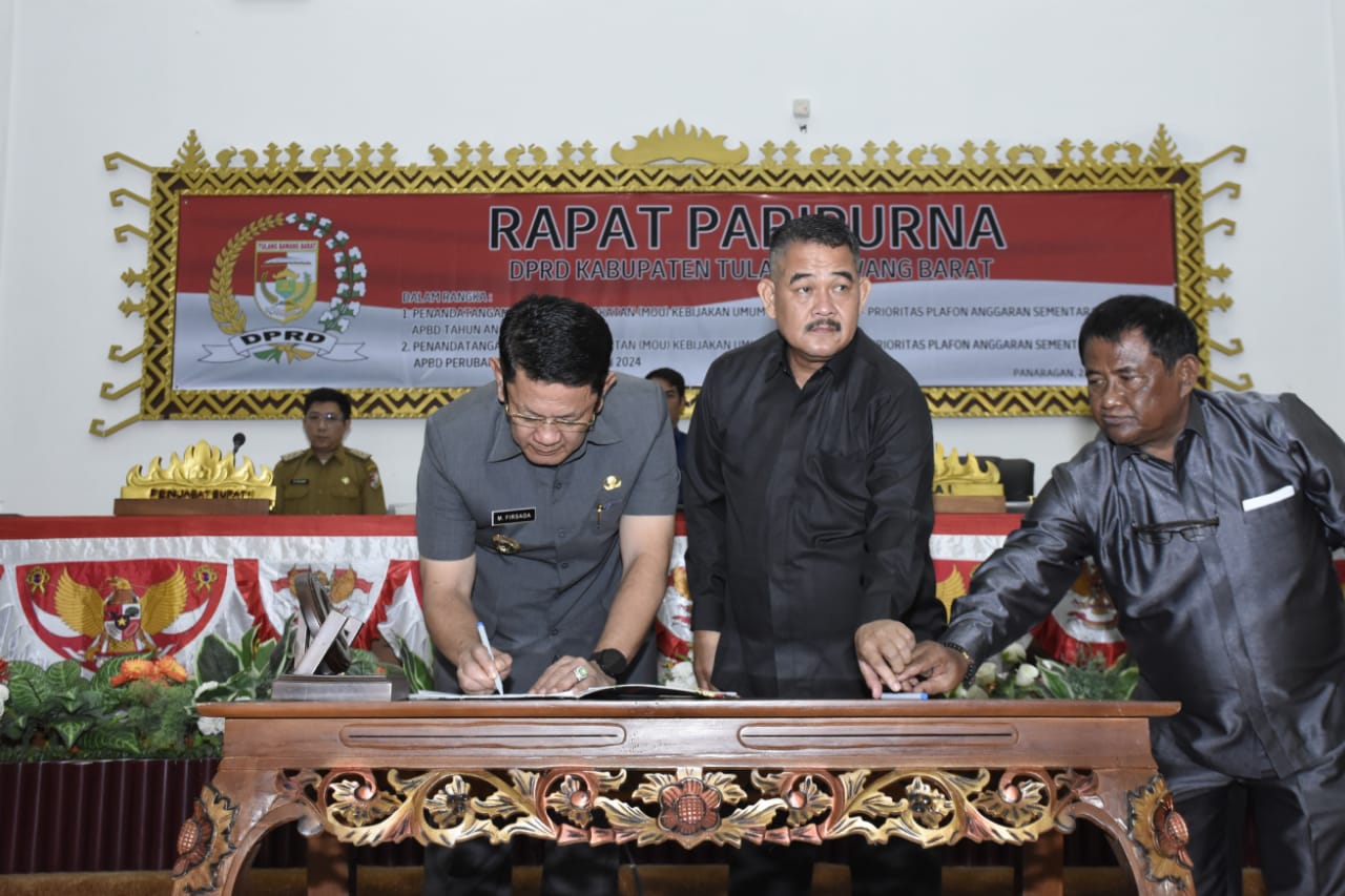 WANMEDIA.CO.ID, TUBABA – Penjabat (Pj) Bupati Tulang Bawang Barat (Tubaba) Drs. M.Firsada, bersama Pimpinan DPRD Tubaba sepakat menandatangani Nota Kesepakatan Kebijakan Umum Anggaran (KUA) dan Prioritas Plafon Anggaran Sementara (PPAS) Anggaran Pendapatan dan Belanja Daerah (APBD) Perubahan Tahun Anggaran (TA) 2024.