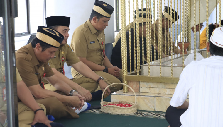 Pj. Andi Ony didampingi Pj. Sekda serta kepala OPD dan tokoh masyarakat lakukan berdoa dan menaburkan bunga di makam Raden Aria Wangsakara di Desa Lengkong Kec. Pagedangan.