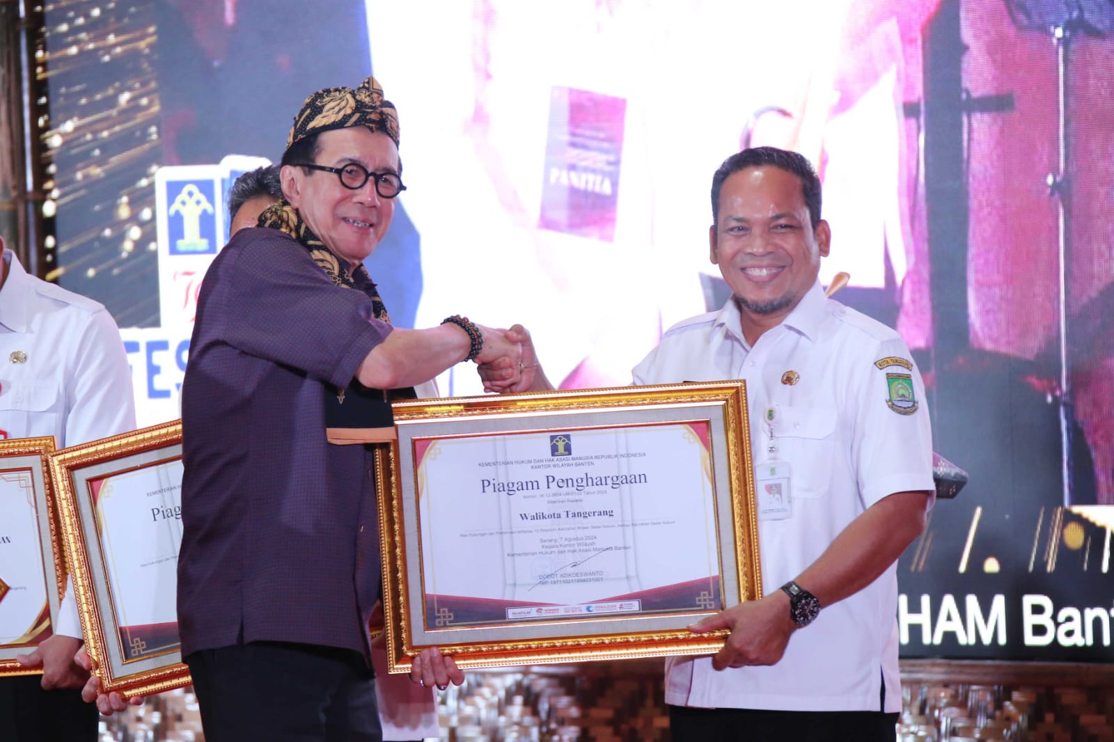 Piagam penghargaan diserahkan langsung kepada Pj Wali Kota Tangerang oleh Menkumham RI, Yasonna Laoly, dalam acara Festival Layanan Hukum dan HAM Banten 2024, yang digelar di Lapangan LPKA Kelas 1 Tangerang, Rabu petang, (07/08).
