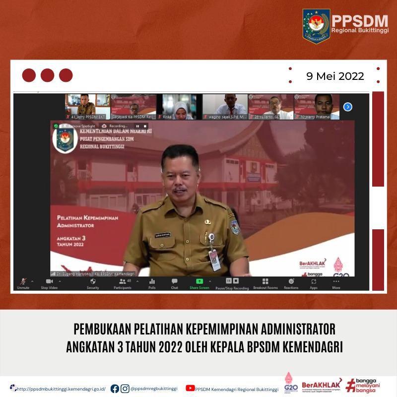 WANMEDIA.CO.ID, Bukittinggi – Pusat Pengembangan Sumber Daya Manusia (PPSDM) Kementerian Dalam Negeri (Kemendagri) Regional Bukittingi menggelar Pelatihan Kepemimpinan Administrator (PKA) Angkatan ke-III. Agenda ini bertujuan untuk meningkatkan pengetahuan, keterampilan, dan sikap bagi Pejabat Administrator. Melalui kegiatan ini diharapkan peserta dapat melaksanakan tugas jabatan secara operasional dengan dilandasi kepribadian etika Pegawai Negeri Sipil (PNS) sesuai dengan kebutuhan instansi.