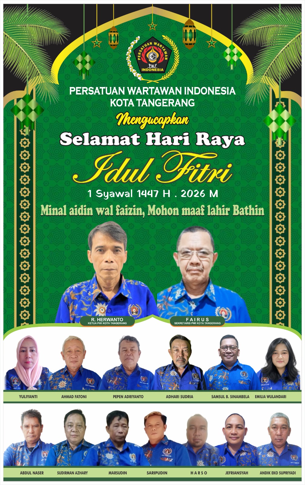 WANMEDIA.CO.ID, TANGERANG – Ketua Persatuan Wartawan Indonesia (PWI) Kota Tangerang, R. Herwanto, bersama jajaran pengurus dan anggota menyampaikan ucapan Selamat Hari Raya Idulfitri 1447 Hijriah kepada seluruh masyarakat, Jumat (20/03/2026).