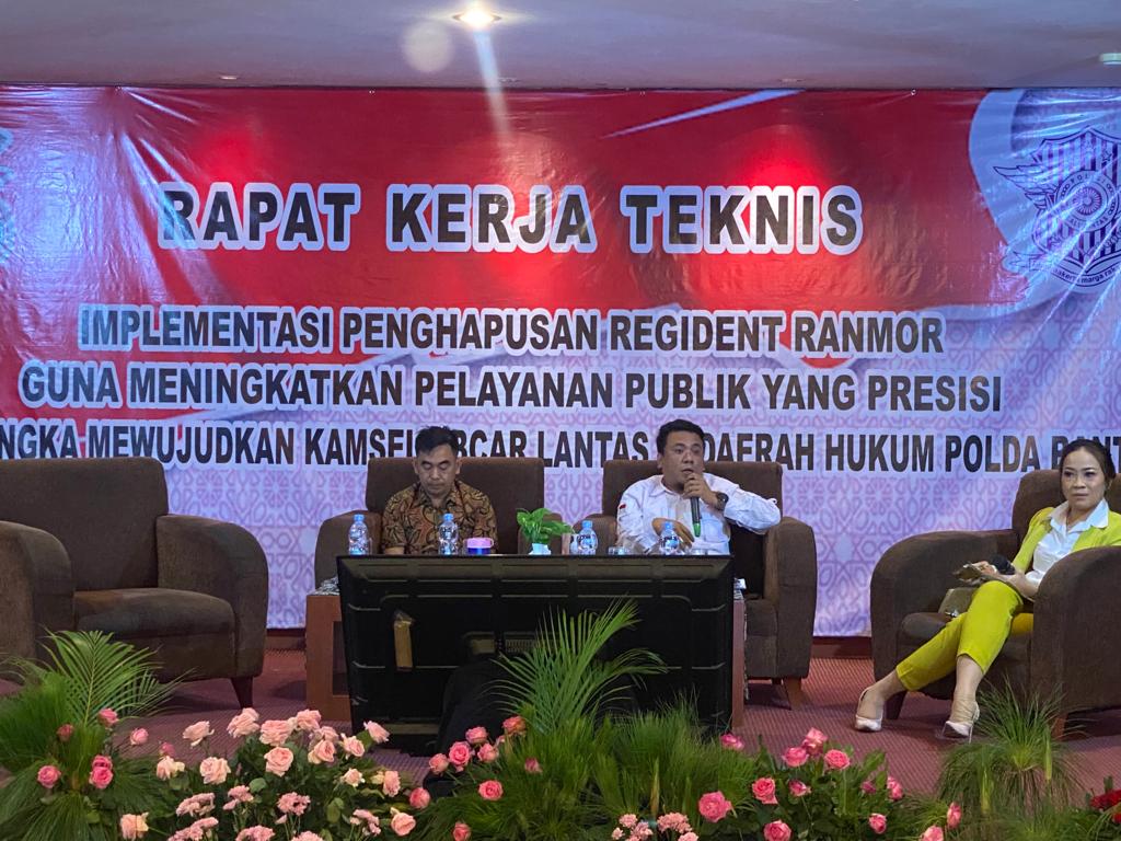 WANMEDIA.CO.ID, SERANG – Direktorat Lalu Lintas (Ditlantas) Polda Banten gelar rapat kerja teknis (Rakernis) terkait implementasi penghapusan Registrasi dan Identifikasi (Regident) kendaraan bermotor (Ranmor) di daerah hukum Polda Banten yang dilaksanakan di Aula Banten Ball Room Hotel Le Dian Kota Serang, Jumat 21 Oktober 2022.