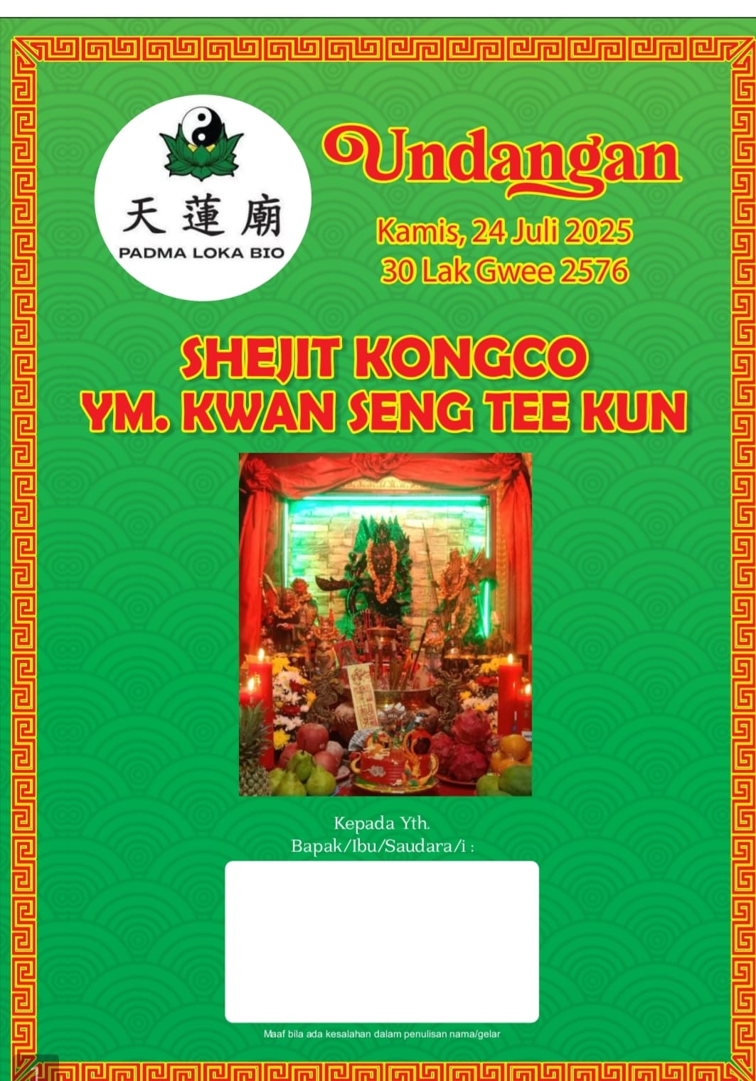 WANMEDIA.CO.ID, KOTA TANGERANG – Vihara Padma Loka Bio, yang terletak di Jalan Cikahuripan Sewan Rawan Kucing RT 02/06 No. 48 (Masuk Gg. Bakmi Koyan), Mekarsari, Neglasari, Kota Tangerang, menjadi tuan rumah acara Shejit YM. Kongco Kwan Seng Tee Kun. Acara ini dihadiri oleh berbagai lapisan masyarakat, termasuk umat Buddha dan masyarakat sekitar.