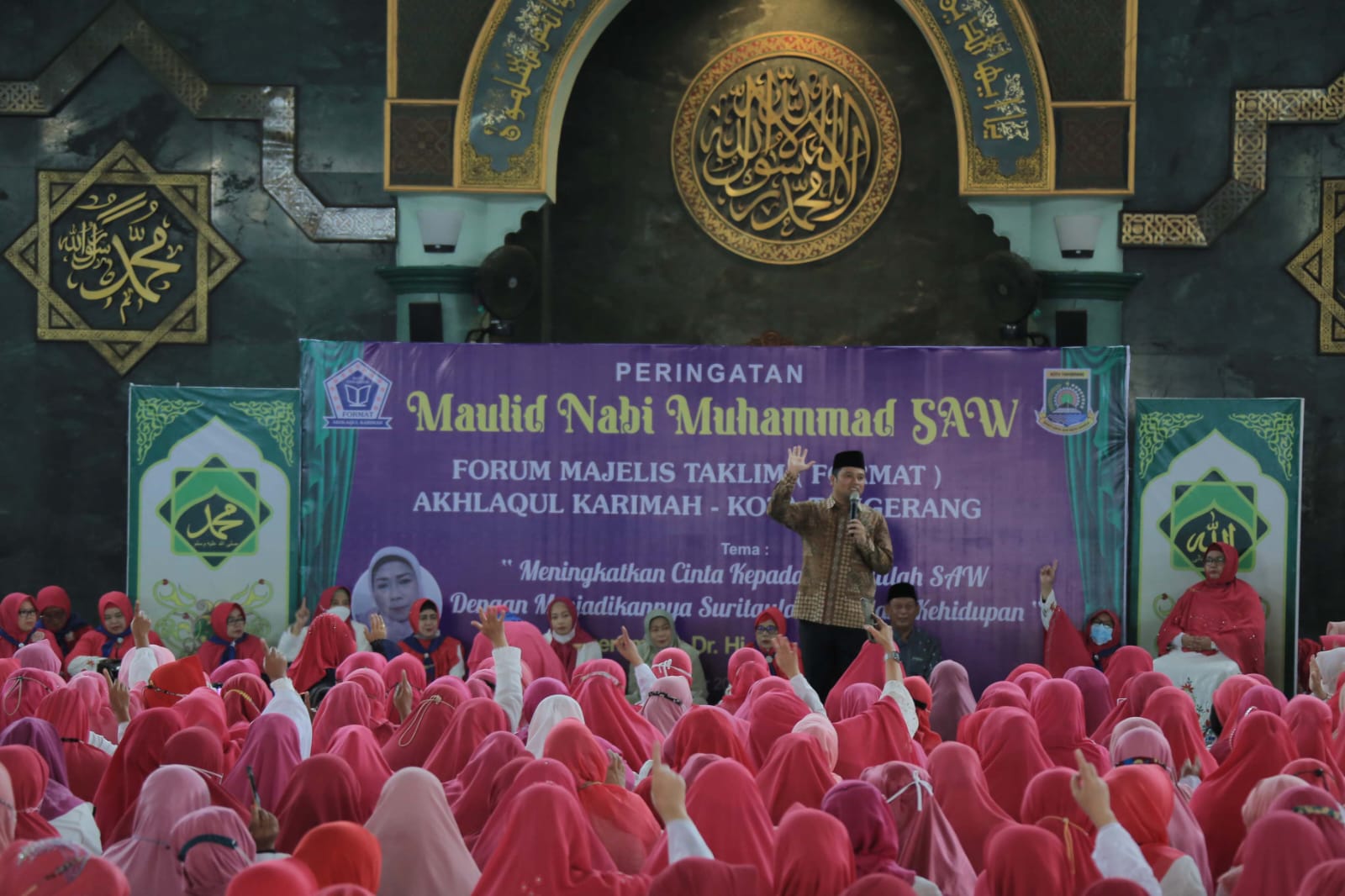Wali Kota Tangerang H. Arief R. Wismansyah turut melakukan sosialisasi pentingnya Perilaku Hidup Bersih Sehat (PHBS) dan sanitasi kepada ribuan jamaah yang mengikuti pengajian Forum Majelis Ta’lim (FORMAT) Akhlaqul Karimah pada Peringatan Maulid Nabi Muhamad SAW 1444 H.