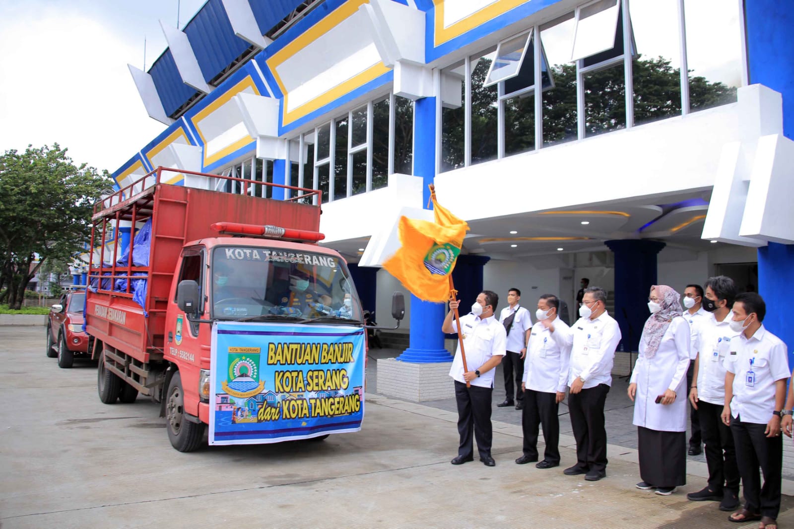 Wali Kota Tangerang H. Arief R. Wismansyah didampingi oleh Sekretaris Daerah Kota Tangerang Herman Suwarman melepas keberangkatan bantuan logisitik yang dikirimkan langsung oleh tim Badan Penanggulangan Bencana Daerah (BPBD) Kota Tangerang dari Stadion Benteng Reborn, Rabu (2/3).