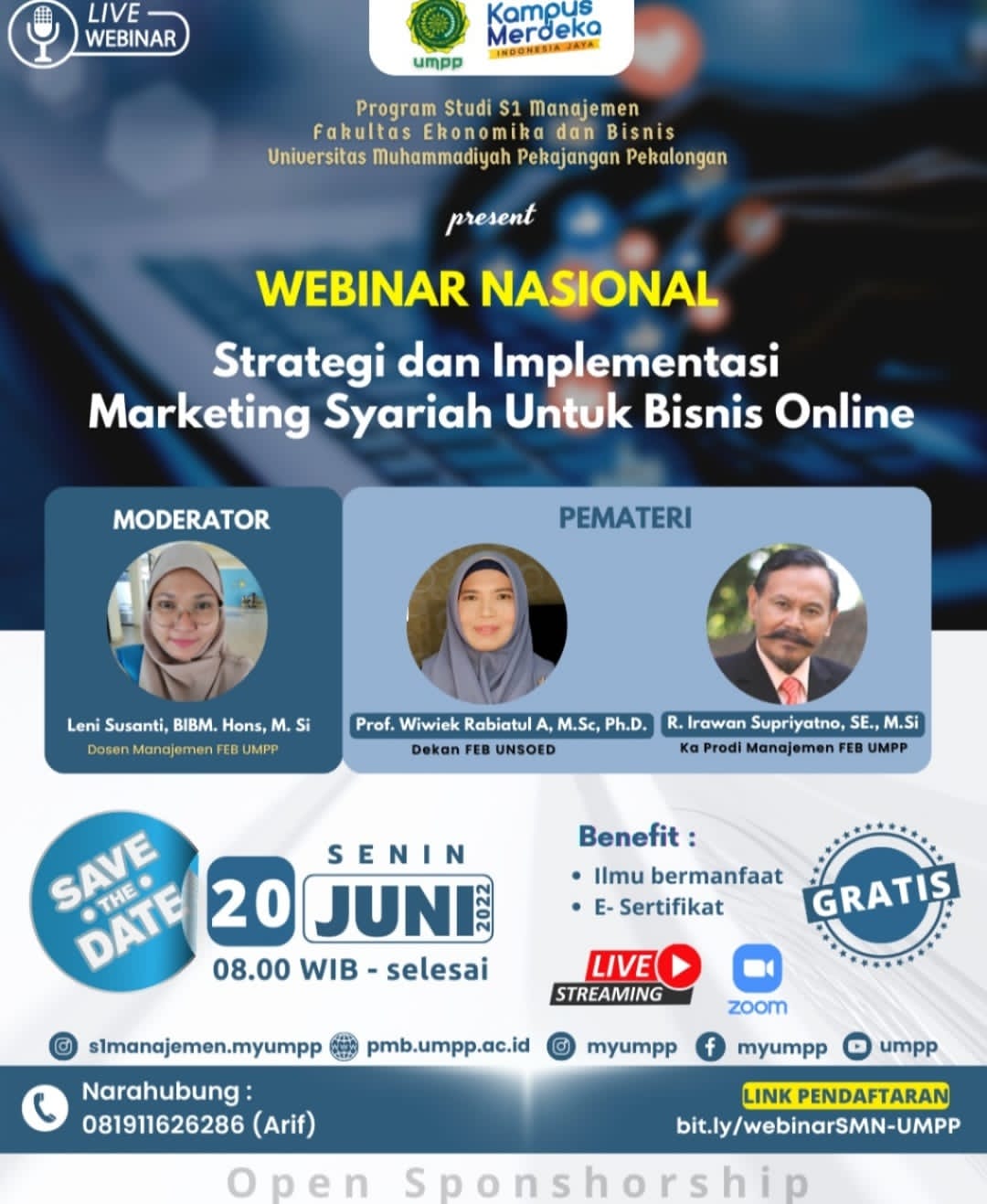 Arip menjelaskan, “Acara tersebut akan dipandu selaku Moderator Leni Susanti, BIBM. Hons, M.Si., sedangkan para narasumber para Dosen dan para pakarnya Prof. Wiwiek Rabiatul A, M.Sc, Ph.D., dari Dekan FEB UNSOED Purwokerto sedangkan R. Irawan Supriyanto, SE, M.Si., dari Ka. Prodi Manajemen FEB UMPP Pekalongan,” jelasnya.