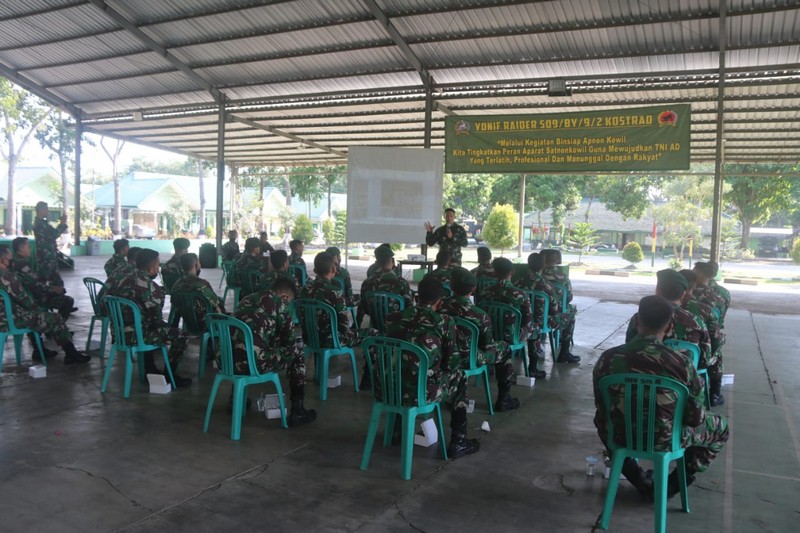 WANMEDIA.CO.ID, JAKARTA – Yonif Raider 509/BY Kostrad menggelar kegiatan pembinaan kesiapan Aparat Non Komando Kewilayahan bagi para prajuritnya dengan Tema “Melalui kegiatan Binsiap Apnonkowil kita tingkatkan peran aparat Satnonkowil guna mewujudkan TNI AD yang terlatih, profesional dan manunggal dengan rakyat”, bertempa di Aula GSG , Jember, Jawa Timur, Kamis (27/05/2021).